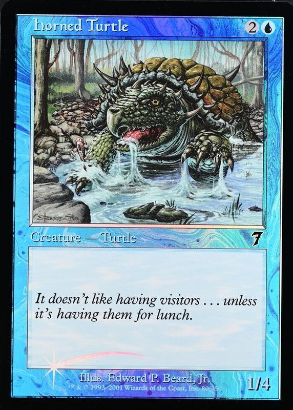 The Horned Turtle 2001 Seventh Edition #80 Foil card in Raw TCG (Near Mint) condition has not changed in price in the last 30 days and was last sold for $10.24 .