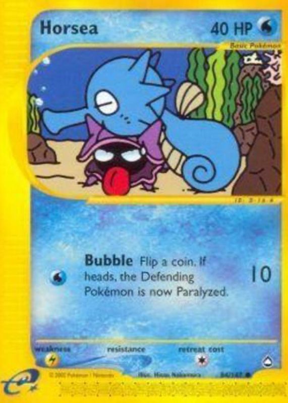 The Horsea 2003 Aquapolis #084/147 Base card in Raw TCG (Near Mint) condition has moved up $2.01 (+50.4%) in the last 30 days and was last sold for $6.00 .