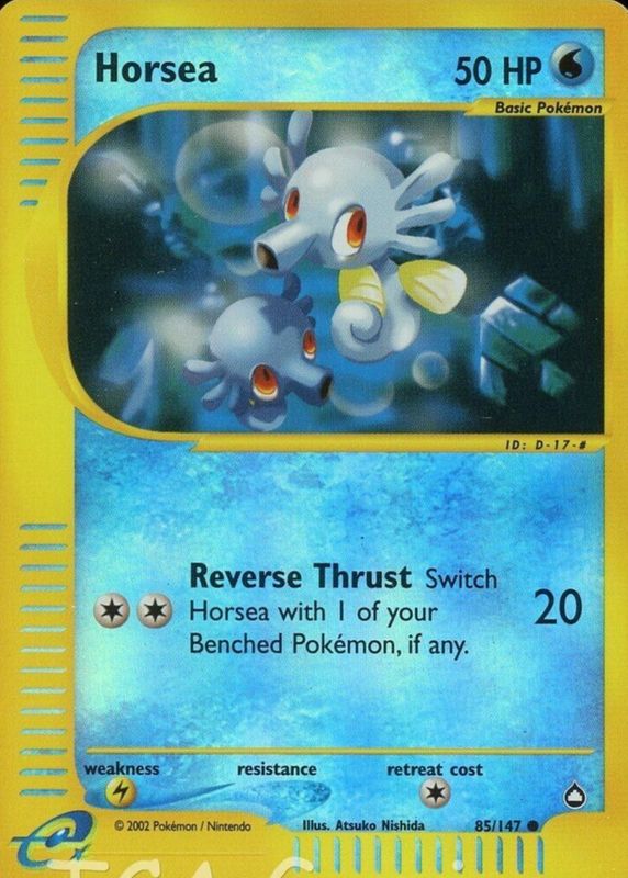 The Horsea 2003 Aquapolis #085/147 Reverse Holo card in Raw TCG (Near Mint) condition has not changed in price in the last 30 days and was last sold for $29.81 .