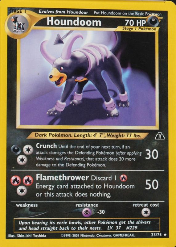 The Houndoom 2001 Neo Discovery #23/75 Unlimited card in Raw TCG (Lightly Played) condition has moved up $3.01 (+30.1%) in the last 30 days and was last sold for $13.00 .