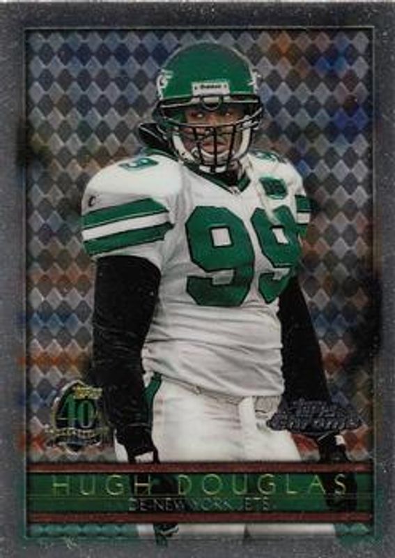 The Hugh Douglas 1996 Topps Chrome #141 Base card is 1 of 2 Hugh Douglas' card variations in the 1996 Topps Chrome set being tracked by Sports Card Investor, including Refractor.
