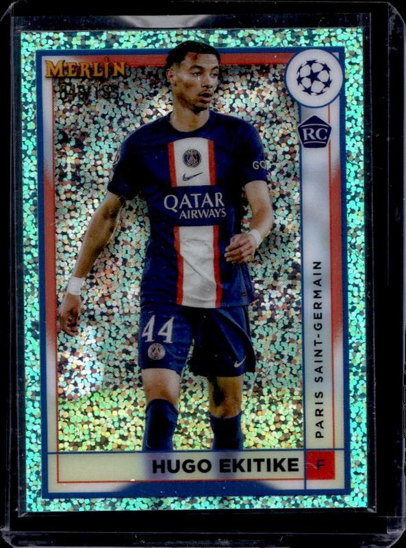 The Hugo Ekitike 2022 Topps Merlin Chrome UEFA Club Competitions #100 Aqua Speckle Refractor /199 Rookie card is 1 of 17 Hugo Ekitike's card variations in the 2022 Topps Merlin Chrome UEFA Club Competitions set being tracked by Sports Card Investor, including Base, Refractor, Neon Green Shimmer Refractor /350, Rose Gold Shimmer Refractor /299, and Pink Mojo Refractor /275.