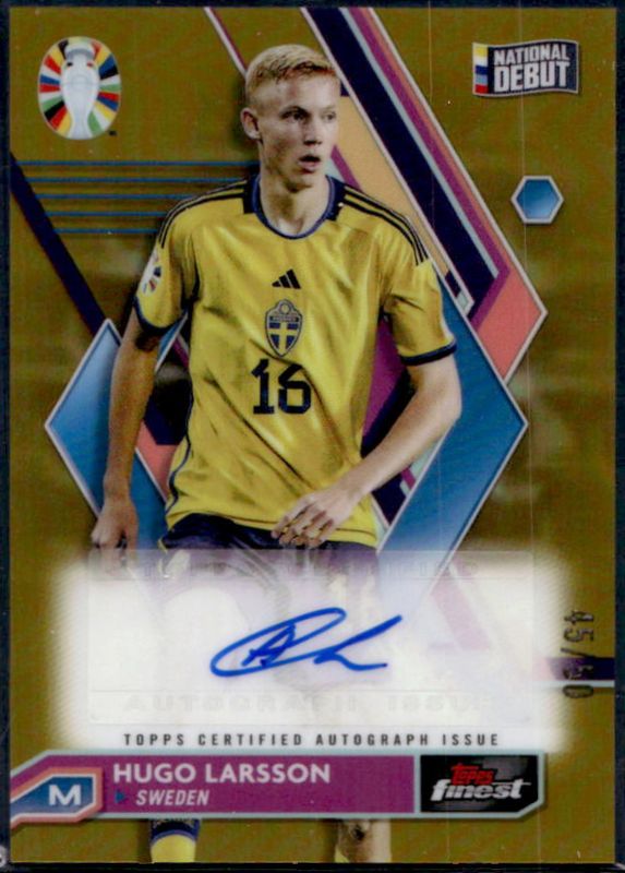 The Hugo Larsson 2023 Topps Finest Road to UEFA Euro #BCA-HL Card Autographs - Gold Refractor /50 Rookie card is 1 of 34 Hugo Larsson's card variations in the 2023 Topps Finest Road to UEFA Euro set being tracked by Sports Card Investor, including Base, Refractor, Blue Aqua Vaporwave Refractor /250, Blue Refractor /150, and Green Speckle Refractor /125.