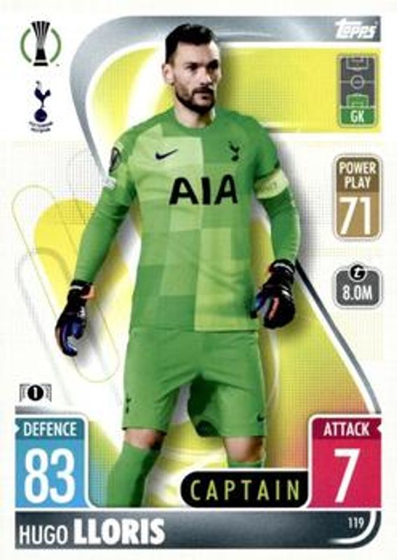 The Hugo Lloris 2021 Topps Match Attax Champions & Europa League #119 Base card is 1 of 2 Hugo Lloris' card variations in the 2021 Topps Match Attax Champions & Europa League set being tracked by Sports Card Investor, including Crystal.
