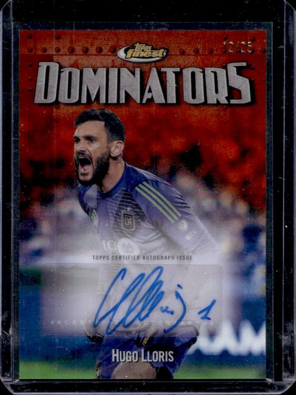 The Hugo Lloris 2024 Topps Finest MLS #DOM-HL Finest Dominators Autographs - Orange Refractor /25 card is 1 of 90 Hugo Lloris' card variations in the 2024 Topps Finest MLS set being tracked by Sports Card Investor, including #219 Base, #58 Base, #122 Base, #58 Aqua Refractor, and #219 Aqua Refractor.