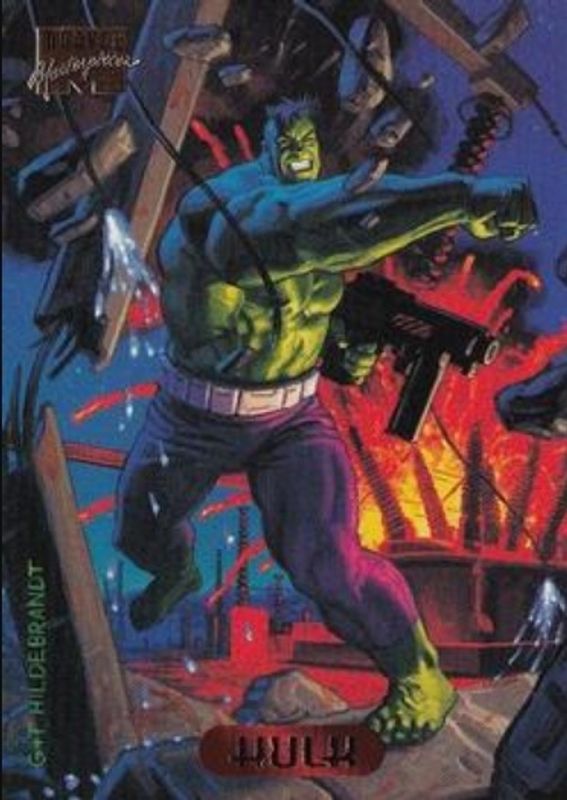 The Hulk 1994 Fleer Marvel Masterpieces Hildebrandt Brothers #50 Base card is 1 of 5 Hulk's card variations in the 1994 Fleer Marvel Masterpieces Hildebrandt Brothers set being tracked by Sports Card Investor, including Gold Foil Signatures, Bronze Holofoils, Gold Holofoils, and Silver Holofoils.
