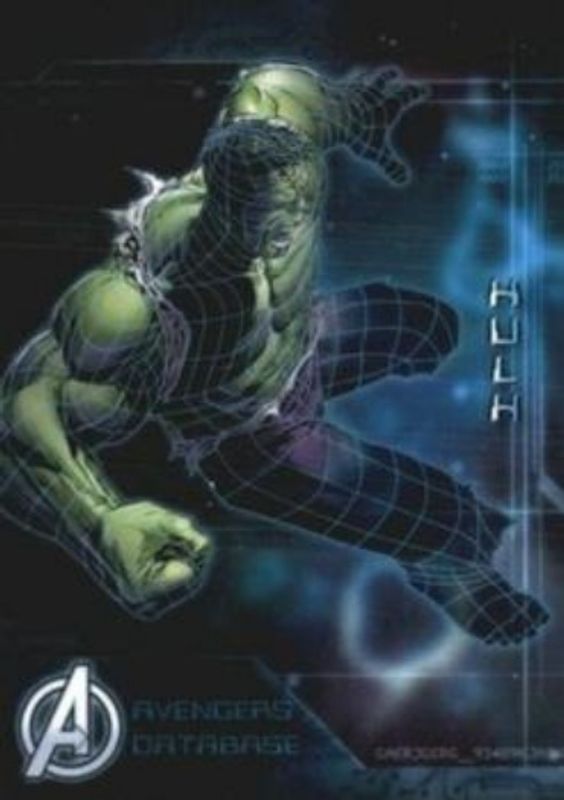 The Hulk 2015 Upper Deck Avengers Age of Ultron #AD-H Avengers' Database card is 1 of 7 Hulk's card variations in the 2015 Upper Deck Avengers Age of Ultron set being tracked by Sports Card Investor, including Avengers Connection Bronze Age, Avengers Connection Silver Age, Avengers Connection Theatrical Age, Avengers' Locker, and Character Shots.