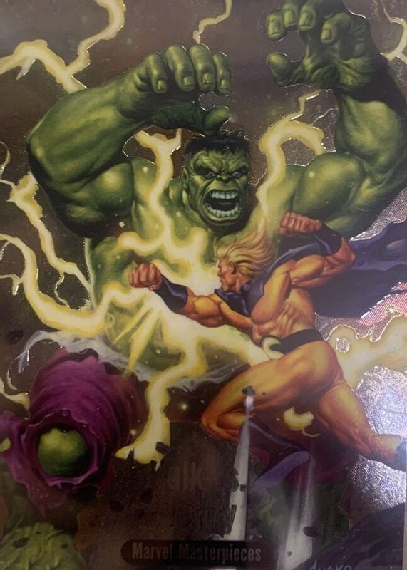 This card is 1 of 2 Hulk vs. Sentry's card variations in the 2016 Upper Deck Marvel Masterpieces set being tracked by Sports Card Investor, including Battle Spectra Gems /99.