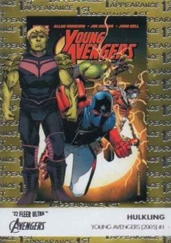 The Hulkling 2022 Fleer Ultra Avengers #FA-13 1st Appearances card is 1 of 28 Hulkling's card variations in the 2022 Fleer Ultra Avengers set being tracked by Sports Card Investor, including Base, Gold Rainbow Foil, Green Foil, Rainbow Foil, and Orange Foil /549.