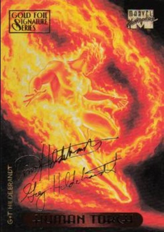 The Human Torch 1994 Fleer Marvel Masterpieces Hildebrandt Brothers #52 Gold Foil Signatures card is 1 of 3 Human Torch's card variations in the 1994 Fleer Marvel Masterpieces Hildebrandt Brothers set being tracked by Sports Card Investor, including Base, and Masterprints.