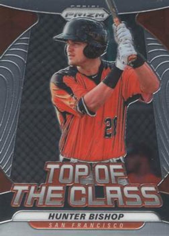 The Hunter Bishop 2020 Prizm #TOC-10 Top of the Class card is 1 of 5 Hunter Bishop's card variations in the 2020 Prizm set being tracked by Sports Card Investor, including Top of The Class - Silver, Top of The Class - Gold /10, Top of The Class - Black Finite /1, and Top of The Class - Gold Vinyl /1.