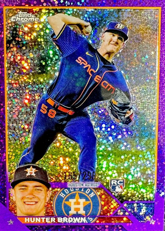 The Hunter Brown 2023 Topps Chrome #197 Purple Speckle Refractor /299 Rookie card in Raw condition has moved down -$11.01 (-91.8%) in the last 30 days and was last sold for $0.99 .