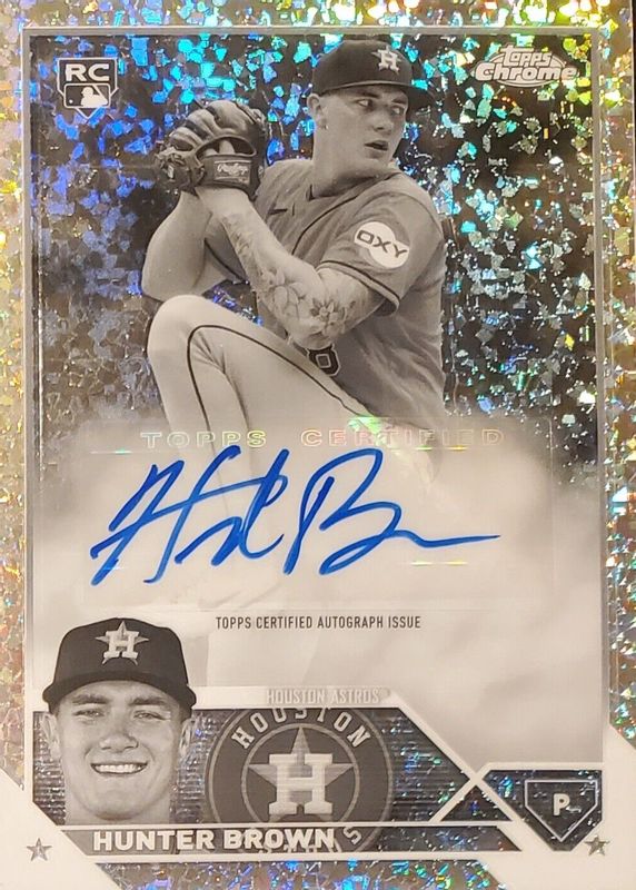 This card is 1 of 16 Hunter Brown's card variations in the 2023 Topps Chrome Update set being tracked by Sports Card Investor, including Autographs, Autographs - Refractor /499, Autographs - Purple Speckle Refractor /299, Autographs - Purple Refractor /250, and Autographs - Aqua Wave Refractor /199.