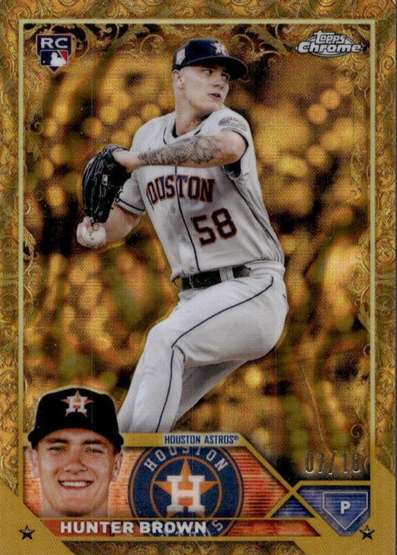 This card is 1 of 6 Hunter Brown's card variations in the 2023 Topps Gilded Collection set being tracked by Sports Card Investor, including Base /99, Wave Gold Etch Refractor /75, Mini-Diamond Gold Etch Refractor /50, RayWave Gold Etch Refractor /25, and Superfractor /1.