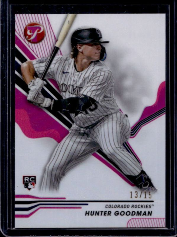 The Hunter Goodman 2024 Topps Pristine #40 Pink Refractor /15 Rookie card is 1 of 26 Hunter Goodman's card variations in the 2024 Topps Pristine set being tracked by Sports Card Investor, including Base, Pristine Refractor, Refractor, Green Refractor /150, and Pristine Purple Refractor /99.