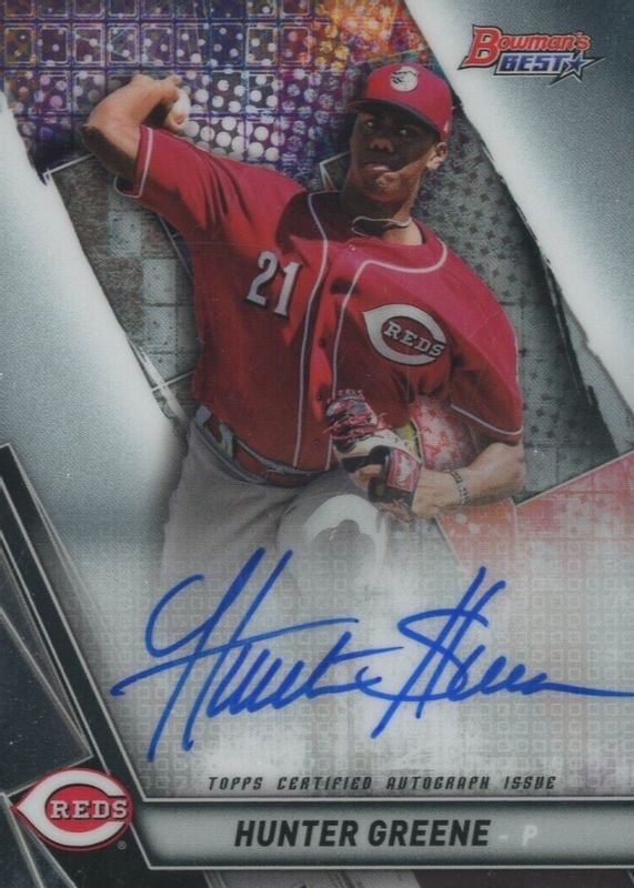 Hunter Greene's Baseball cards are available in at least 58 sets. Hunter Greene's biggest 7-day price movers are 2019 Bowman's Best #B19-HG Best of 2019 Autographs, 2018 Topps Heritage Minor League #ROA-HG Real One Autographs, and 2025 Topps Heritage #96 Chrome - Red Refractor.