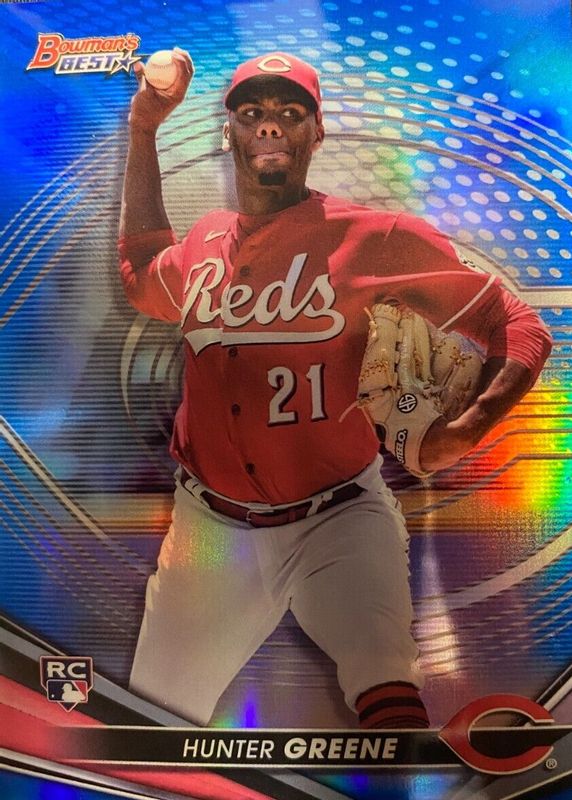 This card is 1 of 15 Hunter Greene's card variations in the 2022 Bowman's Best set being tracked by Sports Card Investor, including Base, Atomic Refractor, Refractor, Mini-Diamond Refractor /299, and Purple Refractor /250.