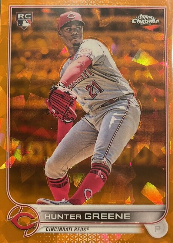 The Hunter Greene 2022 Topps Chrome Sapphire Edition #549 Orange /25 Rookie card in Raw condition has not changed in price in the last 30 days and was last sold for $55.00 .