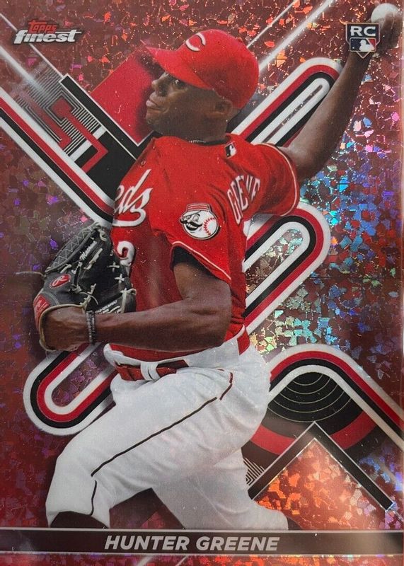 This card is 1 of 19 Hunter Greene's card variations in the 2022 Topps Finest set being tracked by Sports Card Investor, including Base, Refractor, Sky Blue Refractor /300, Blue/Aqua Vapor Refractor /250, and Purple Refractor /250.