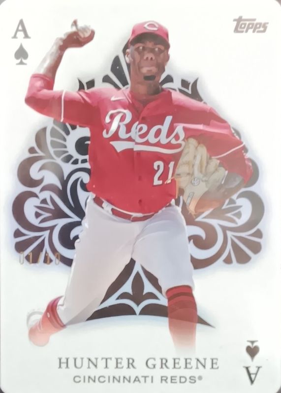 This card is 1 of 7 Hunter Greene's card variations in the 2023 Topps set being tracked by Sports Card Investor, including Golden Mirror Image Variation /(SSP), All Aces, All Aces - Blue, All Aces - Black /299, and All Aces - Gold /75.