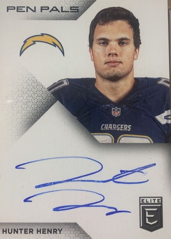Hunter Henry's Football cards are available in at least 19 sets. Hunter Henry's biggest 7-day price movers are 2016 Elite #PP-HH Pen Pals, 2016 Optic #169 Aqua /299, and 2016 Optic #169 Gold Vinyl /1.