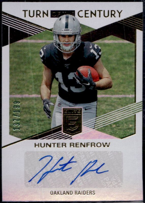 The Hunter Renfrow 2019 Elite #TC-HR1 Turn of the Century Autographs /99 Rookie card is 1 of 24 Hunter Renfrow's card variations in the 2019 Elite set being tracked by Sports Card Investor, including Green, Red /299, Purple /99, Orange /49, and Status Die-Cut /24.