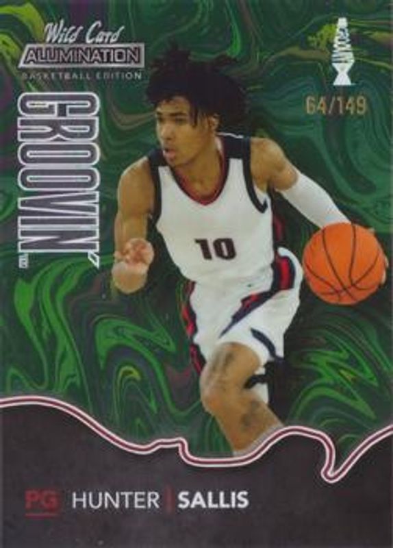 The Hunter Sallis 2021 Wild Card Alumination #GG-13 Green Groovin' Silver /149 card is 1 of 207 Hunter Sallis' card variations in the 2021 Wild Card Alumination set being tracked by Sports Card Investor, including Base, 100 Stripe, 10 Stripe, 20 Stripe, and 50 Stripe.