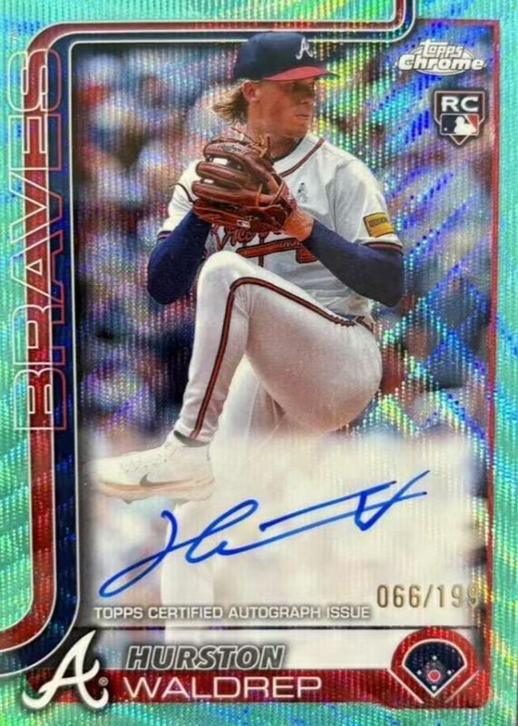 The Hurston Waldrep 2025 Topps Chrome #RA-HW Rookie Autographs - Aqua Wave Refractor /199 card in Raw condition has moved up $5.01 (+18.6%) in the last 30 days and was last sold for $32.00 .