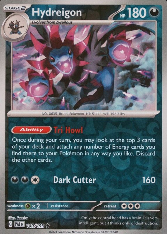 This card is 1 of 3 Hydreigon's card variations in the 2023 Scarlet & Violet: Paldea Evolved set being tracked by Sports Card Investor, including Cosmos Holo - Blister Exclusive, and Holo.