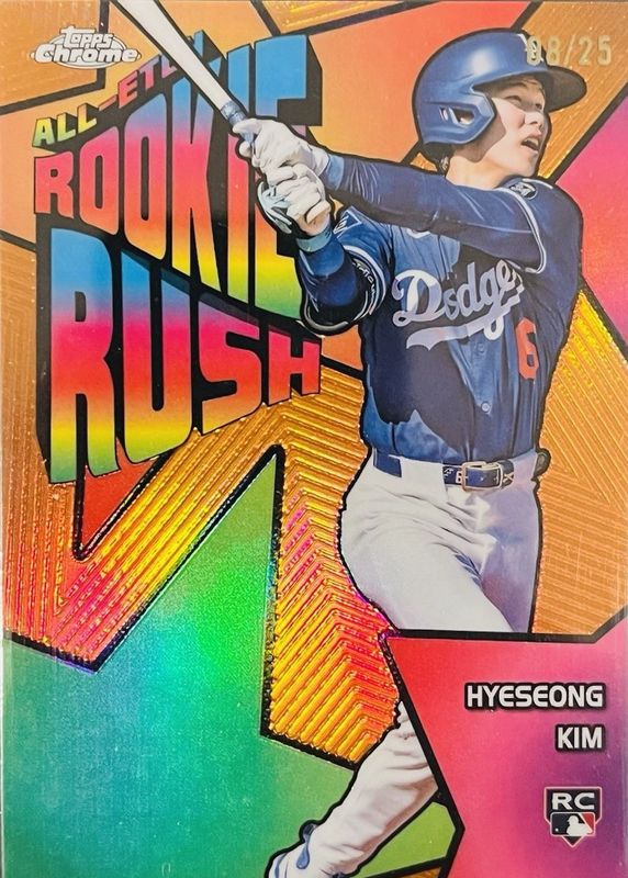 The Hyeseong Kim 2025 Topps Chrome #CERR-3 All-Etch Rookie Rush - Orange Refractor /25 card in Raw condition has not changed in price in the last 30 days and was last sold for $50.00 .