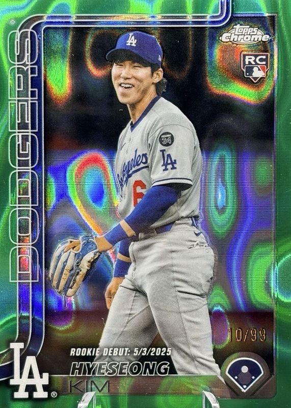 The Hyeseong Kim 2025 Topps Chrome Update #USC149 Rookie Debut - Green Lava Refractor /99 card in Raw condition has moved down -$1.35 (-11.7%) in the last 30 days and was last sold for $10.15 .