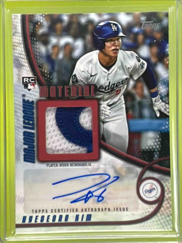 The Hyeseong Kim 2025 Topps Update #MMAU-HK Major League Material Autographs - Red /5 Rookie card is 1 of 126 Hyeseong Kim's card variations in the 2025 Topps Update set being tracked by Sports Card Investor, including Rookie Debut, Rookie Debut - Aqua Holo Foil, Rookie Debut - Aqua Rainbow Foil, Rookie Debut - Diamante Foil, and Rookie Debut - Holiday.