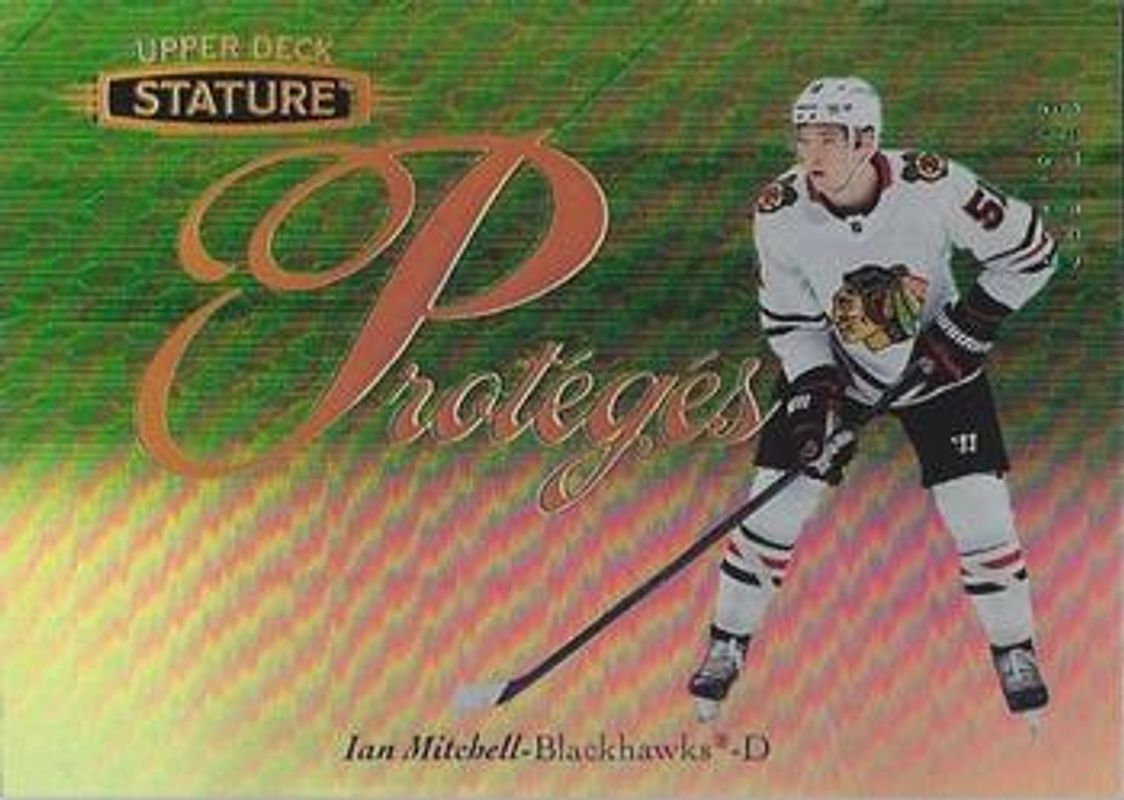 The Ian Mitchell 2020 Upper Deck Stature #P-16 Proteges - Green /149 Rookie card is 1 of 22 Ian Mitchell's card variations in the 2020 Upper Deck Stature set being tracked by Sports Card Investor, including Base /399, Green /175, Portrait /99, Red /85, and Blue /45.