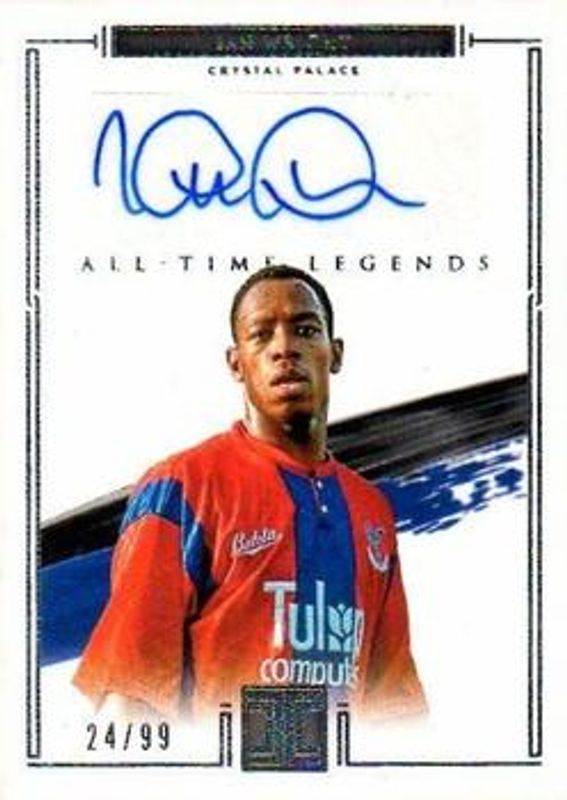 The Ian Wright 2020 Impeccable Premier League #AT-IW All Time Legends /99 card is 1 of 19 Ian Wright's card variations in the 2020 Impeccable Premier League set being tracked by Sports Card Investor, including Impeccable Autographs /99, All Time Legends - Ruby /35, Impeccable Autographs - Ruby /35, All Time Legends - Silver /25, and Impeccable Autographs - Silver /25.