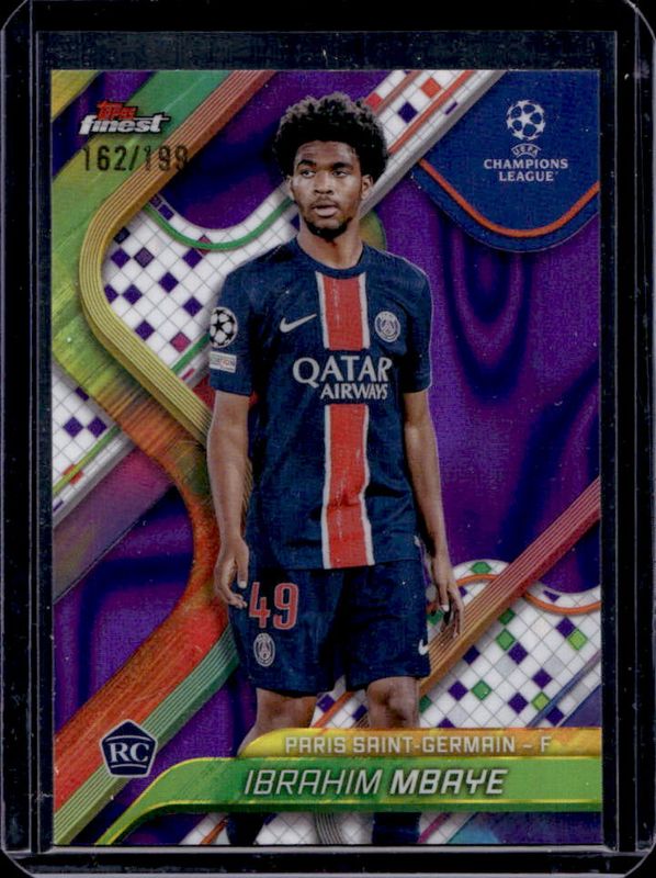 The Ibrahim Mbaye 2024 Topps Finest UEFA Club Competitions #103 Purple Lava Refractor /199 card is 1 of 28 Ibrahim Mbaye's card variations in the 2024 Topps Finest UEFA Club Competitions set being tracked by Sports Card Investor, including Base, Refractor, Purple Refractor /299, Sky Blue Refractor /275, and Pink RayWave Refractor /250.