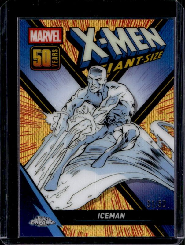 The Iceman 2025 Topps Chrome #XM-5 X-Men Giant Size 50th Anniversary - Gold Wave /50 card is 1 of 29 Iceman's card variations in the 2025 Topps Chrome set being tracked by Sports Card Investor, including Base, Refractor, Yellow Lava Refractor, Spider Web Refractor /399, and Blue Refractor /299.