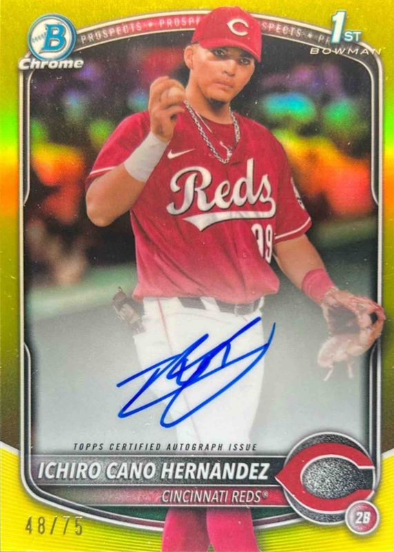 Best Prices Available For Sale of Ichiro Cano Hernandez 2025 Bowman #CPA-IC Chrome Prospect Auto - Yellow Refractor /75 (1st)