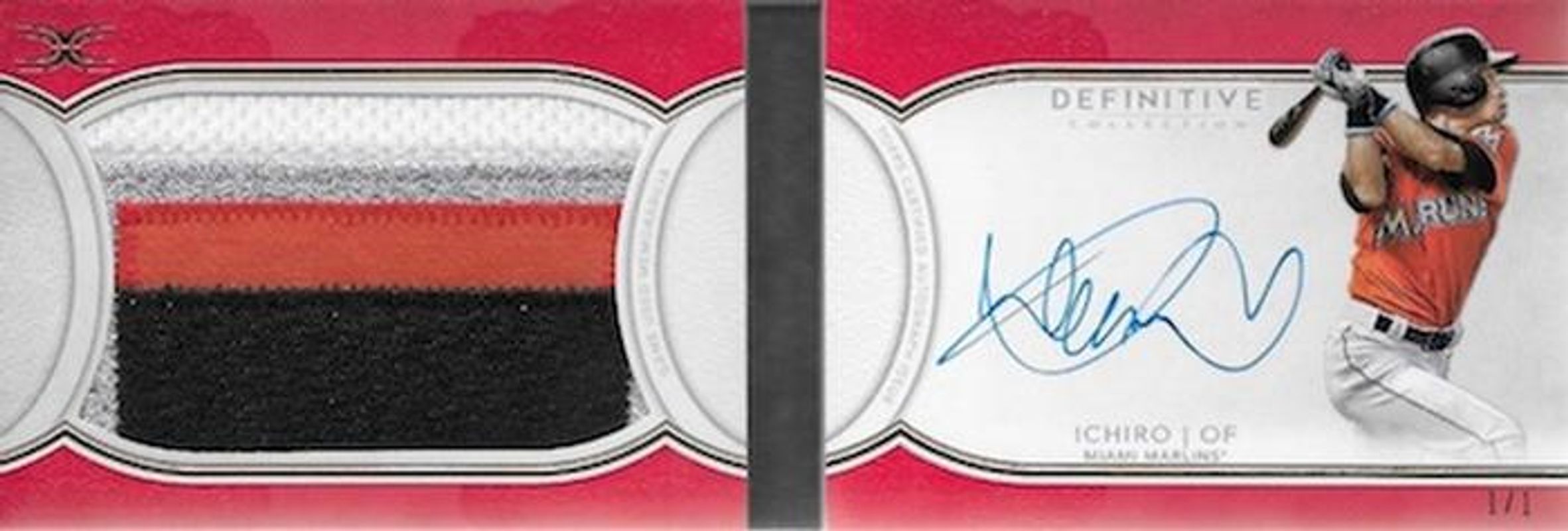 The Ichiro Suzuki 2018 Topps Definitive Collection #DAPB-I Autographs Patch Book Red Team Logo Patch Collection /1 card is 1 of 19 Ichiro Suzuki's card variations in the 2018 Topps Definitive Collection set being tracked by Sports Card Investor, including Base /30, Green /25, Purple /10, Red Button /1, and Red Majestic Logo /1.