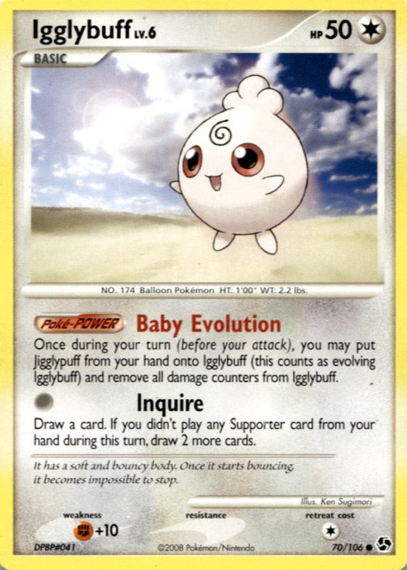 The Igglybuff 2008 Diamond & Pearl: Great Encounters #070/106 Base card in Raw TCG (Near Mint) condition has moved down -$1.51 (-43.0%) in the last 30 days and was last sold for $2.00 .