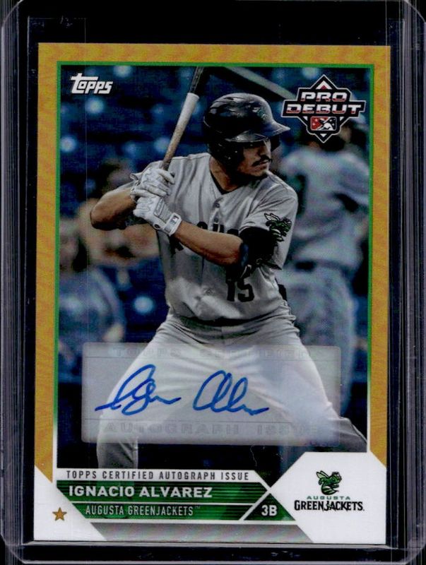 The Ignacio Alvarez 2023 Topps Pro Debut #PD-106 Autographs - Gold /50 card is 1 of 28 Ignacio Alvarez's card variations in the 2023 Topps Pro Debut set being tracked by Sports Card Investor, including Base, Fuchsia /199, Sparkle /175, Blue /150, and Green /99.