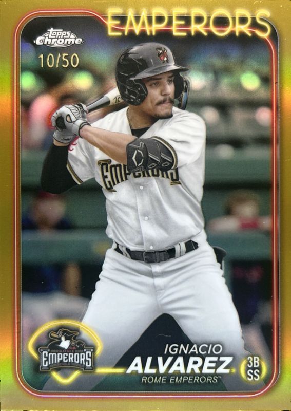 The Ignacio Alvarez 2024 Topps Pro Debut #PDC-186 Chrome - Gold Refractor /50 card is 1 of 28 Ignacio Alvarez's card variations in the 2024 Topps Pro Debut set being tracked by Sports Card Investor, including Base, Fuchsia Foil /199, Sparkle Foil /175, Blue Foil /150, and Green Foil /99.