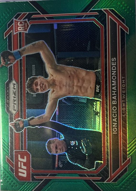 The Ignacio Bahamondes 2023 Prizm UFC #62 Green Rookie card in Raw condition has not changed in price in the last 30 days and was last sold for $2.83 .