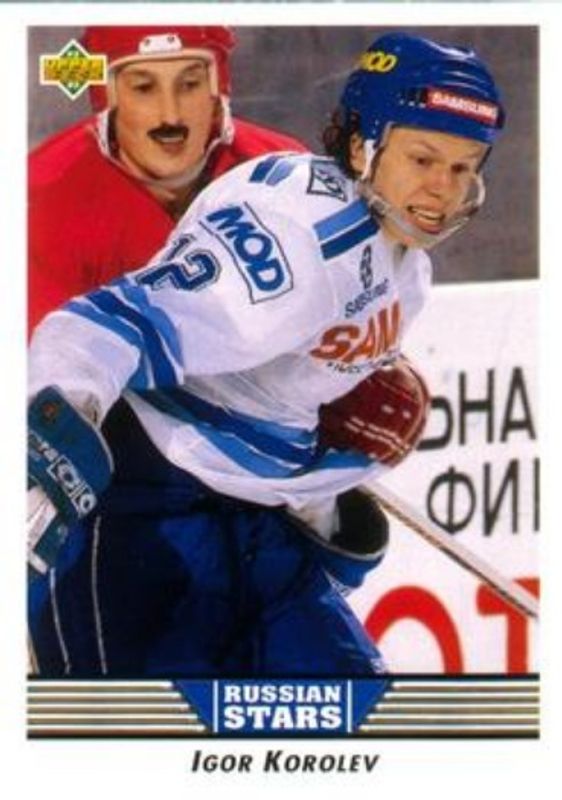 The Igor Korolev 1992 Upper Deck #338 Base Rookie card is 1 of 4 Igor Korolev's card variations in the 1992 Upper Deck set being tracked by Sports Card Investor, including Base, Calder Candidates, and Euro Rookies.