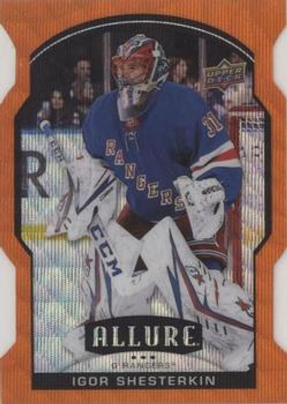 The Igor Shesterkin 2020 Upper Deck Allure #21 Orange Slice card is 1 of 32 Igor Shesterkin's card variations in the 2020 Upper Deck Allure set being tracked by Sports Card Investor, including Base, 2005 Shield, Black Rainbow, Blue China, and Leopard.