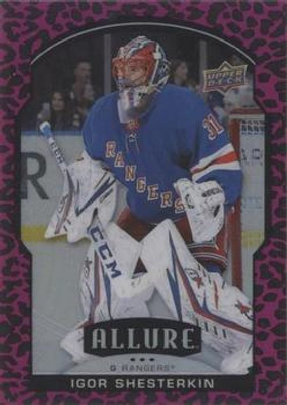 The Igor Shesterkin 2020 Upper Deck Allure #21 Pink Leopard card is 1 of 32 Igor Shesterkin's card variations in the 2020 Upper Deck Allure set being tracked by Sports Card Investor, including Base, 2005 Shield, Black Rainbow, Blue China, and Leopard.