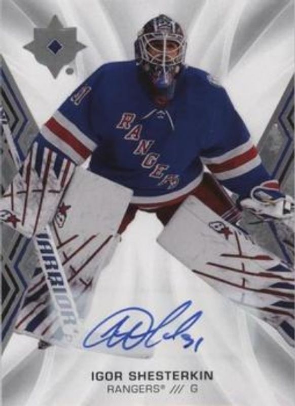 The Igor Shesterkin 2021 Upper Deck Ultimate Collection #31 Autographs card is 1 of 14 Igor Shesterkin's card variations in the 2021 Upper Deck Ultimate Collection set being tracked by Sports Card Investor, including Base /299, Gold /35, Purple /15, Black /5, and Ultimate Display - Auto Jersey /99.