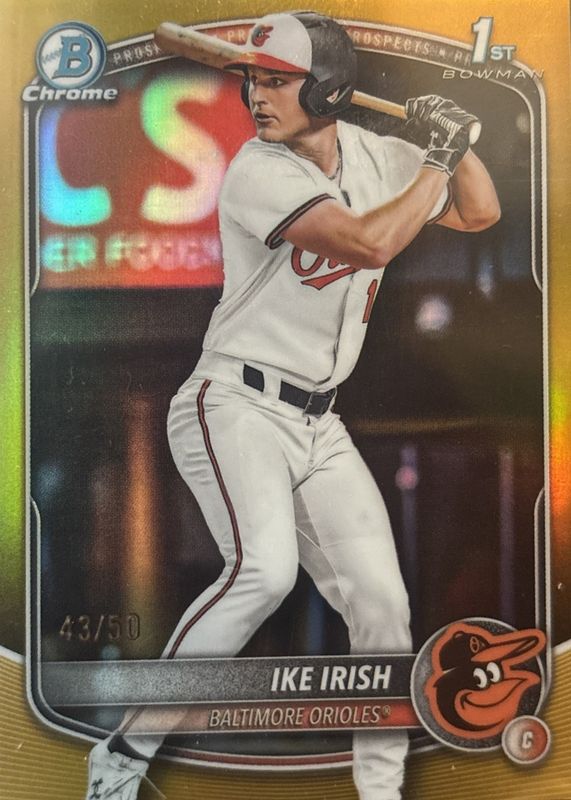 The Ike Irish 2025 Bowman Draft #BDC-16 Chrome - Gold Refractor /50 (1st) card in Raw condition has not changed in price in the last 30 days and was last sold for $65.00 .