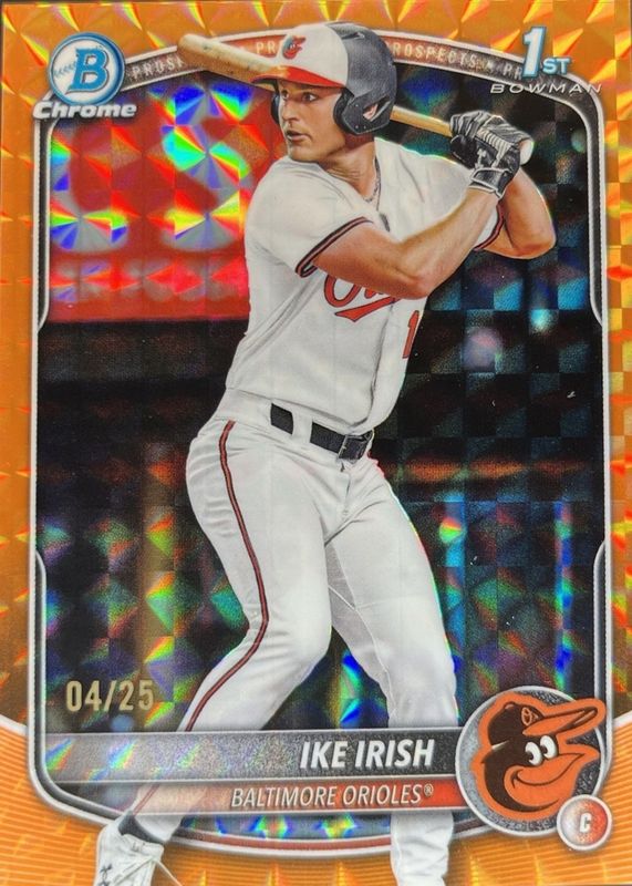 The Ike Irish 2025 Bowman Draft #BDC-16 Chrome - Orange Geometric Refractor /25 (1st) card in Raw condition has not changed in price in the last 30 days and was last sold for $139.50 .