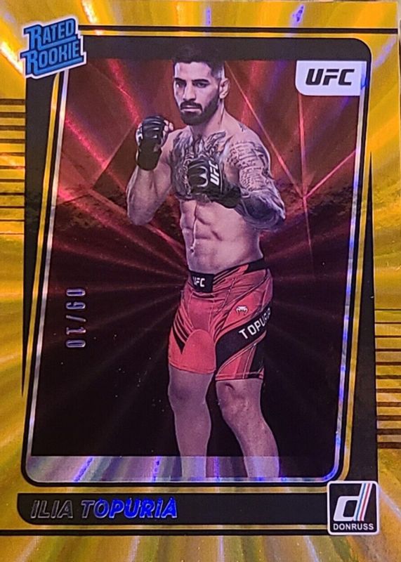 The Ilia Topuria 2022 Donruss UFC #215 Holo Gold Laser /10 Rookie card in Raw condition has not changed in price in the last 30 days and was last sold for $215.49 .