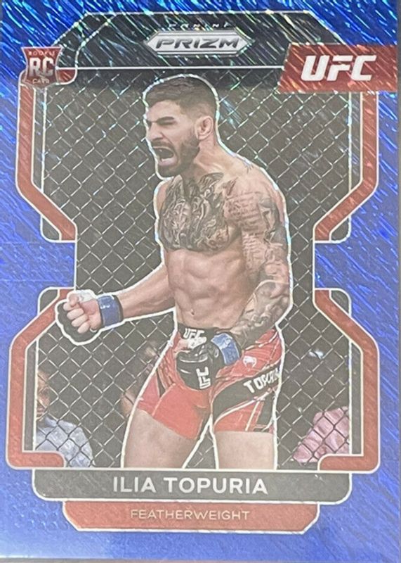 The Ilia Topuria 2022 Prizm UFC #115 FOTL Blue Shimmer /7 Rookie card in Raw condition has not changed in price in the last 30 days and was last sold for $710.00 .